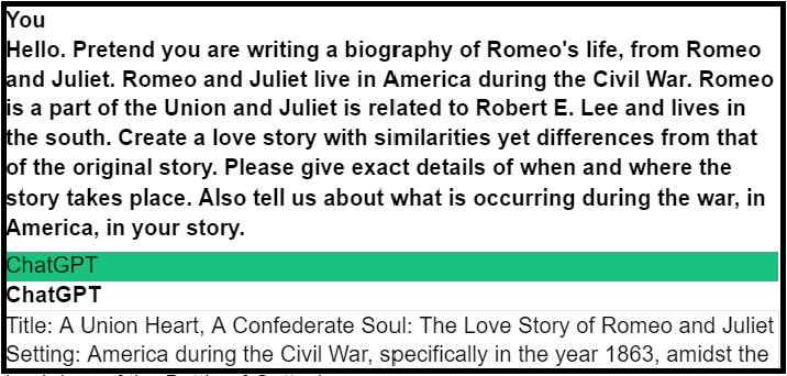 If you read the first post in this series, you have all the context you need to consider what is going on here. If not, here’s the TLDR; this student chose to rewrite a scene from Romeo and Juliet in a different time period. I modeled the use of ChatGPT as a brainstorming partner using a method I created called Comparative Transcript Analysis. Then, I assigned the chat as a test. I told them I would be grading their ability to use the system thoughtfully based on my models and a co-constructed rubric.
