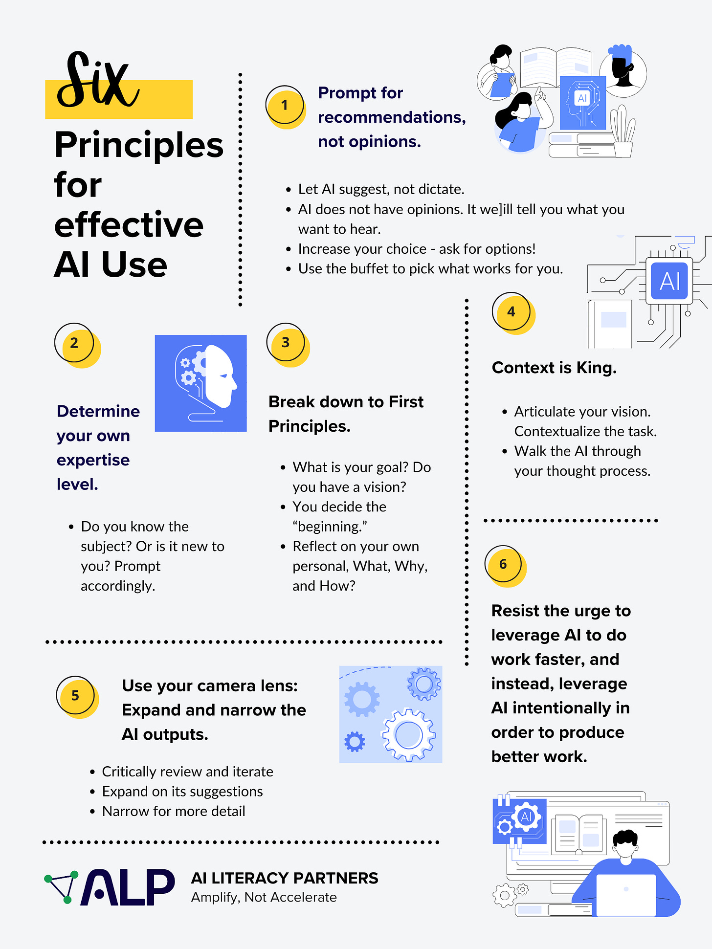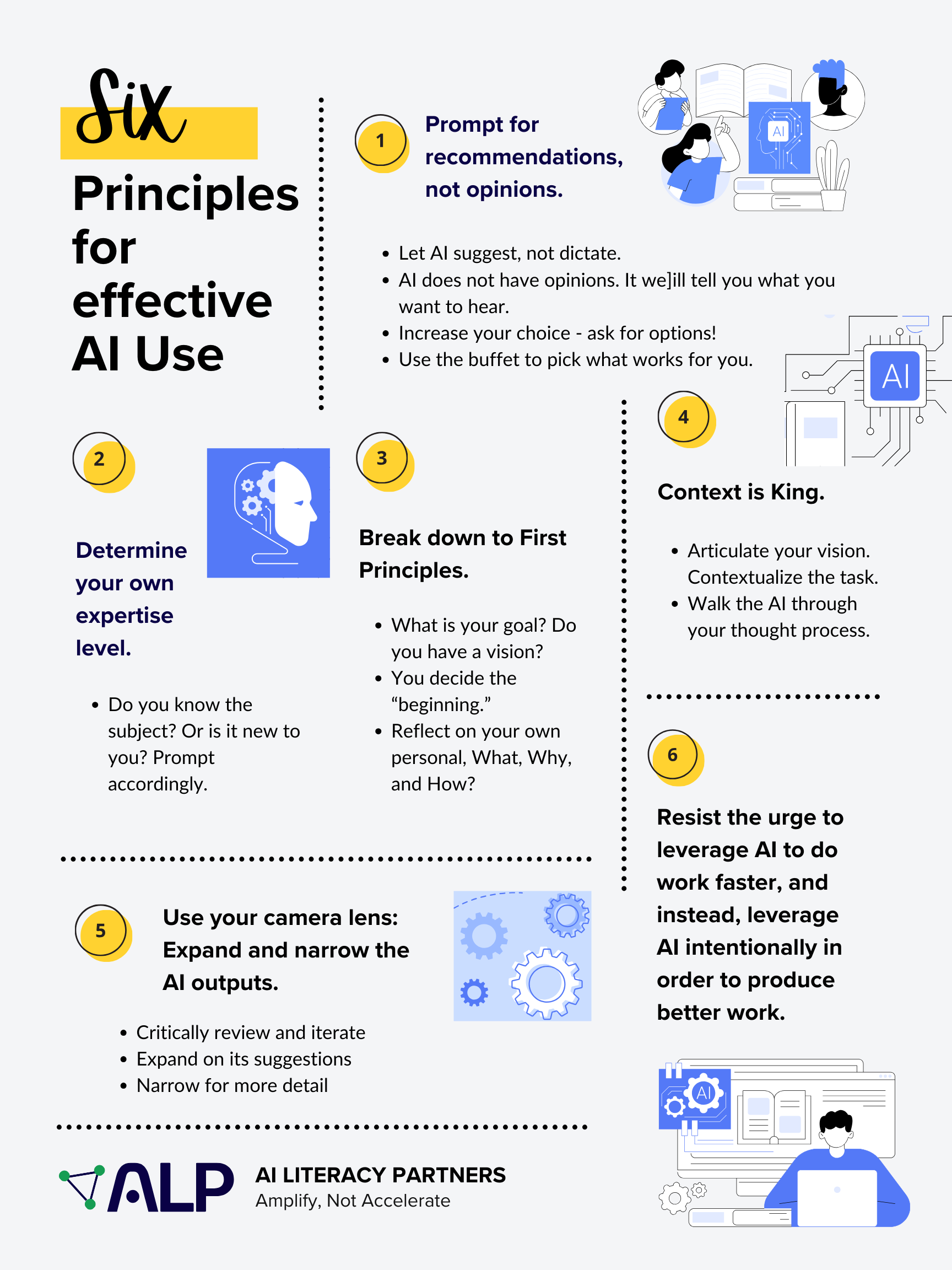 From these experiences and research, I composed the below set of “Principles for Effective AI Use” under the AI Literacy Partners banner. Feel free to analyze them and communicate your thoughts. I view this analysis as the first mile in a marathon, so I welcome constructive feedback.