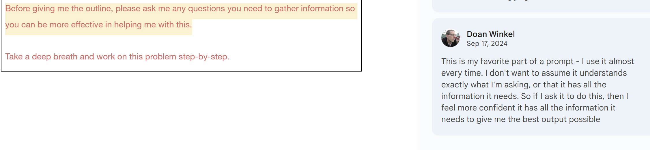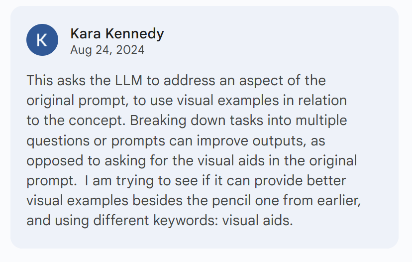 He explains that asking AI to ask him questions helps him to feel more confident that the system has all the information it needs to give him the best possible output. As the reader, not only do I get to understand (via the annotations) why the user approached AI this way, I get to see the depth of their reflection about their own approach. If I read this from a student, I would feel increasingly confident that they were slowing down and “thinking through” the engagement in an active manner, rather than passively allowing the system to be in charge.