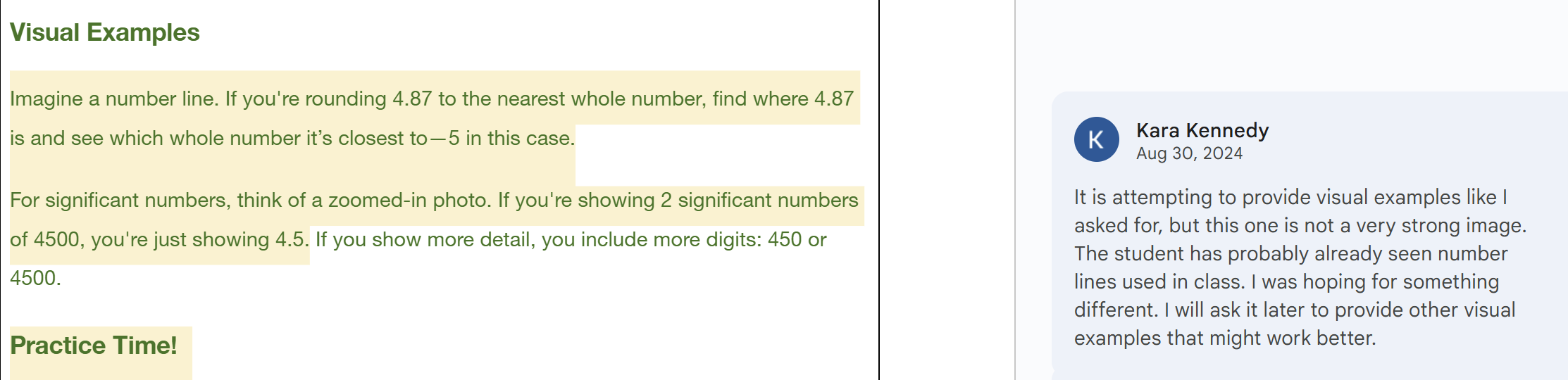 As a reader, I see a narrative of thinking developing. Even further, as an educator, if I were reading a student's chat and their accompanying annotations in this type of model, I could better understand why they took a particular approach and what they were seeking to achieve.