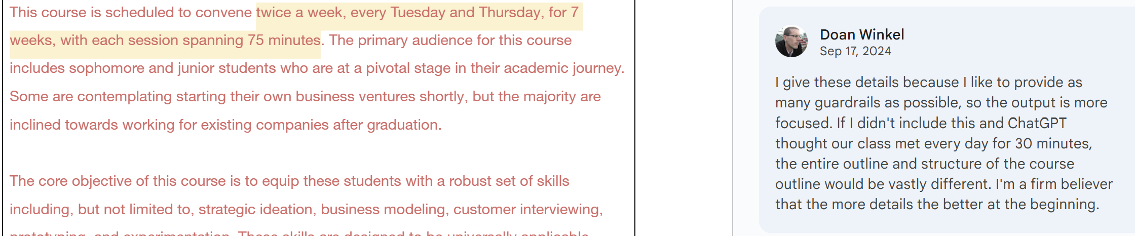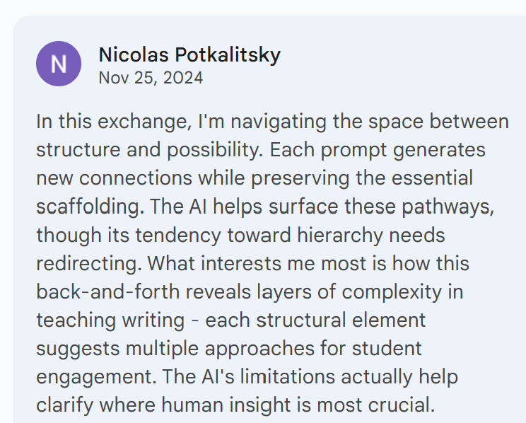 He names that if he didn't include this additional context, then the entire structure and outline of the course would be vastly different and potentially worse. Again, it’s not about whether I as the reader agree with that statement. Instead, it allows me as the reader to see an awareness of the potential pathways that exist within an AI interaction — as well as a notable level of discernment with respect to the engagement itself. In student terms, it would be exactly what we want.
